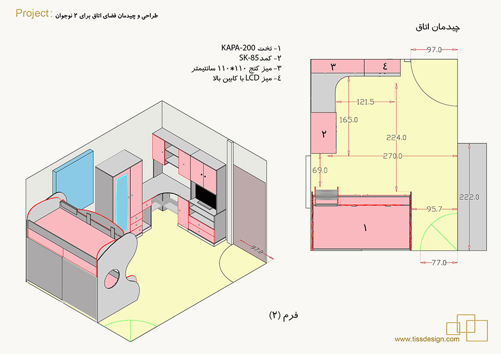 جهت انجام این بخش می توانید با استفاده از آموزشی که در بخش راهنمایی اندازه گیری و پلان برداری فضا در اختیار شما قرار گرفته به همراه چند عکس از فضای موجود خود و لیست قطعات در خواستی، اطلاعات اولیه خود را به تیم طراحی تحویل نموده و چیدمان پشنهادی آتلیه طراحی را دریافت نمایید.